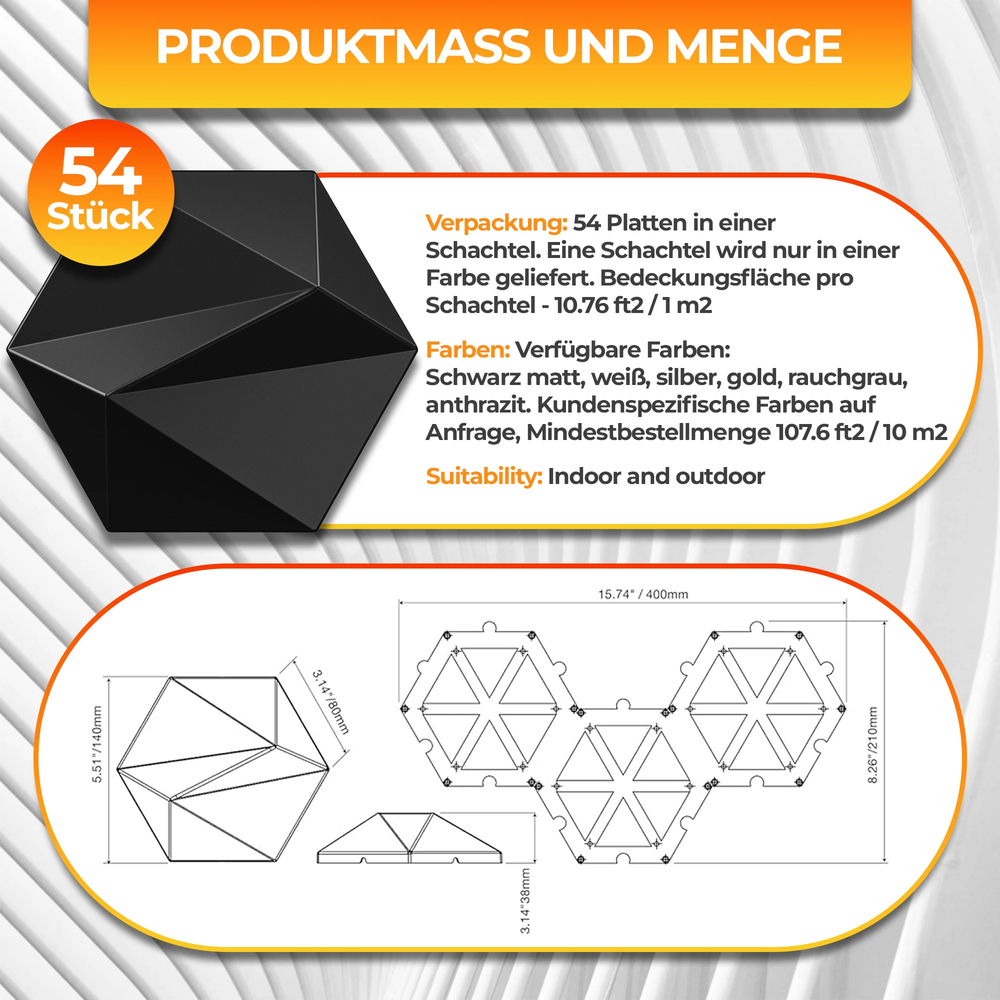 | Verkaufseinheiten pro m²: | 54 Einzelpaneele à 45 Gramm/Paneel inkl. Unterkonstruktion zur Befestigung |