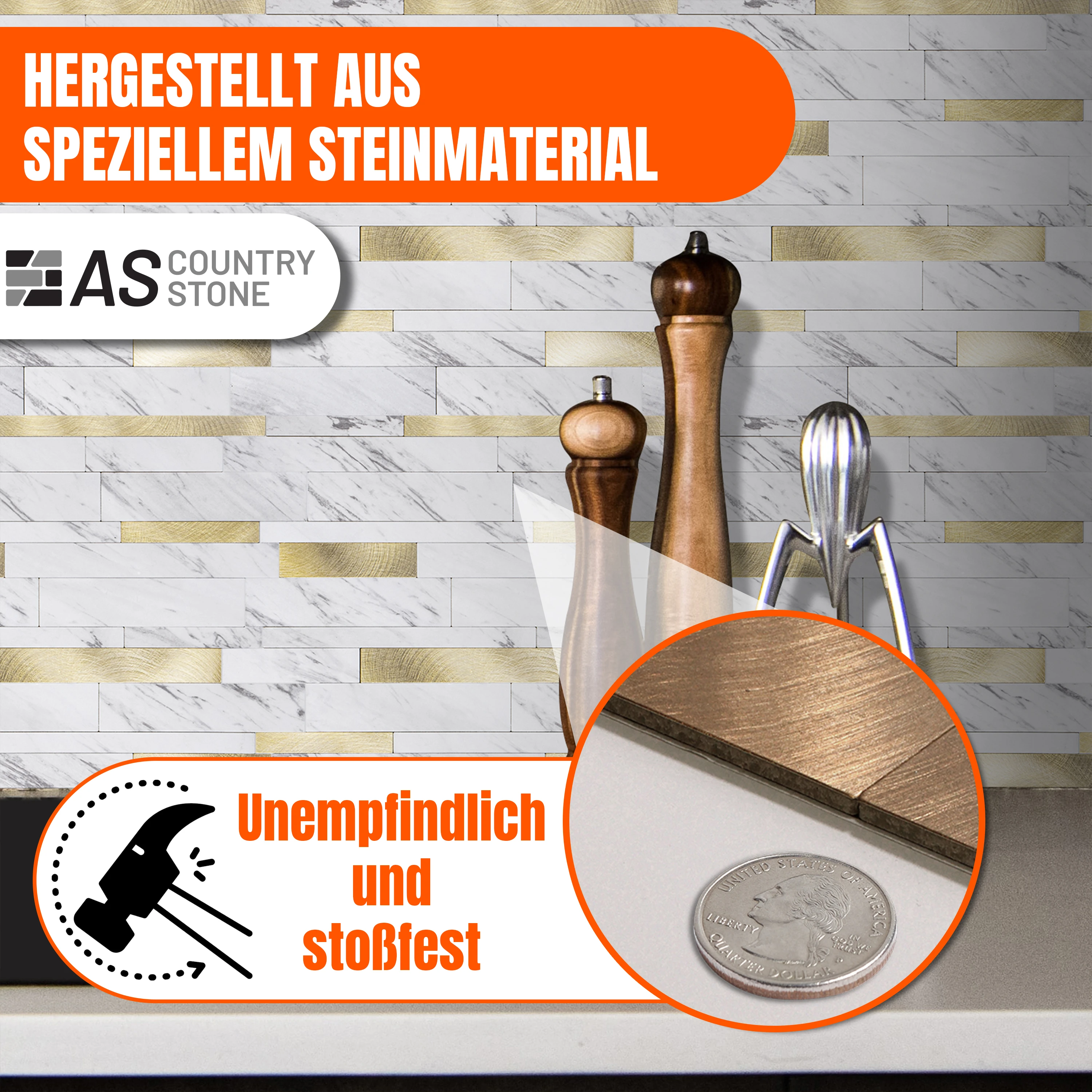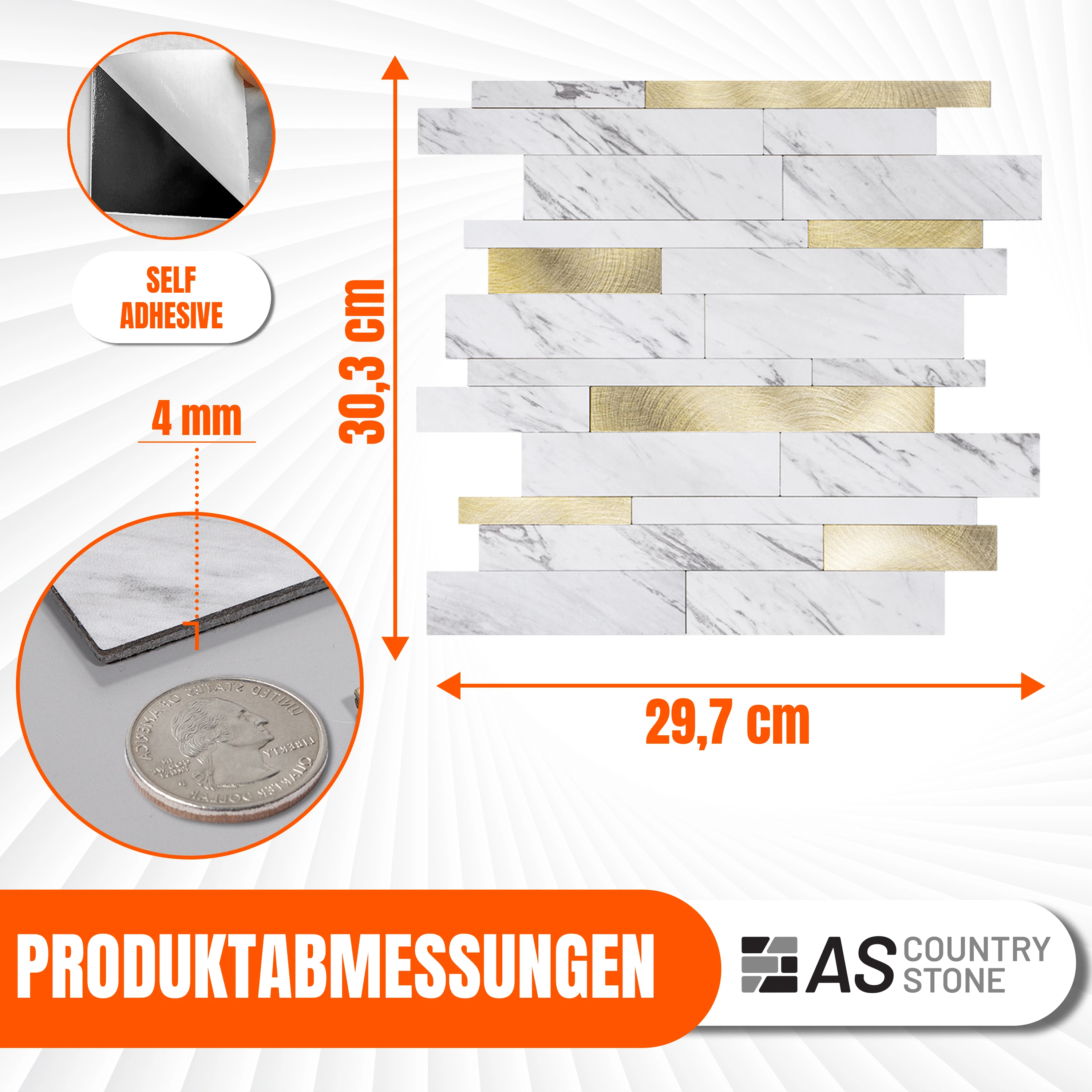 Diese einzigartige Mosaikfliese "WJS-3144" von AS Country Stone vereint das zeitlose Aussehen von weißem Marmor mit modernen, goldenen Akzenten und schafft so ein beeindruckendes Design, das jedem Raum einen Hauch von Luxus verleiht. Die rechteckigen, länglichen Elemente wechseln sich ab und sorgen für ein dynamisches und zugleich elegantes Erscheinungsbild.