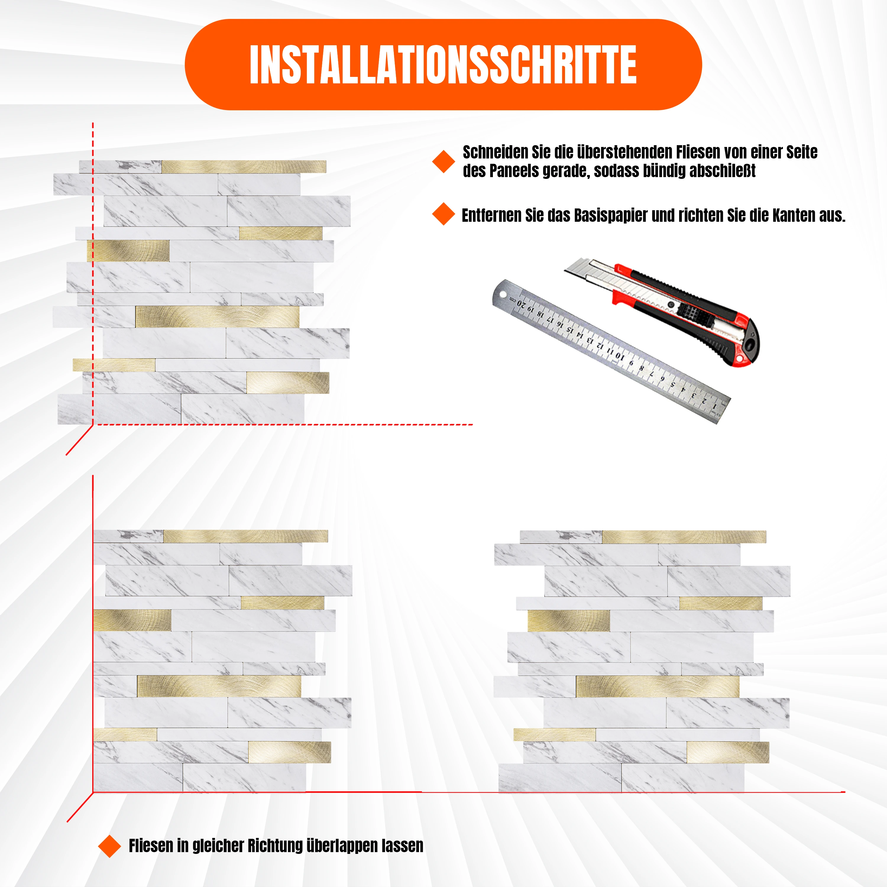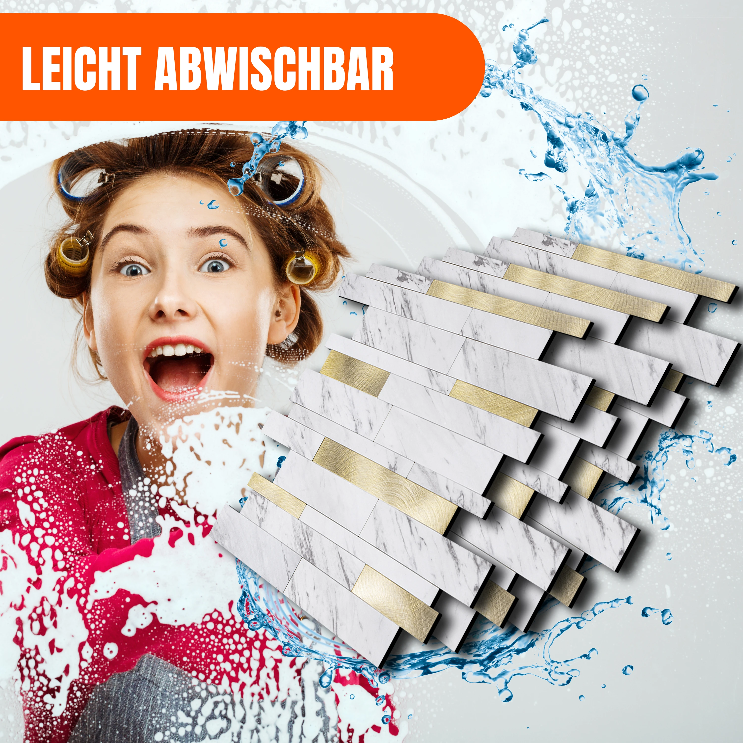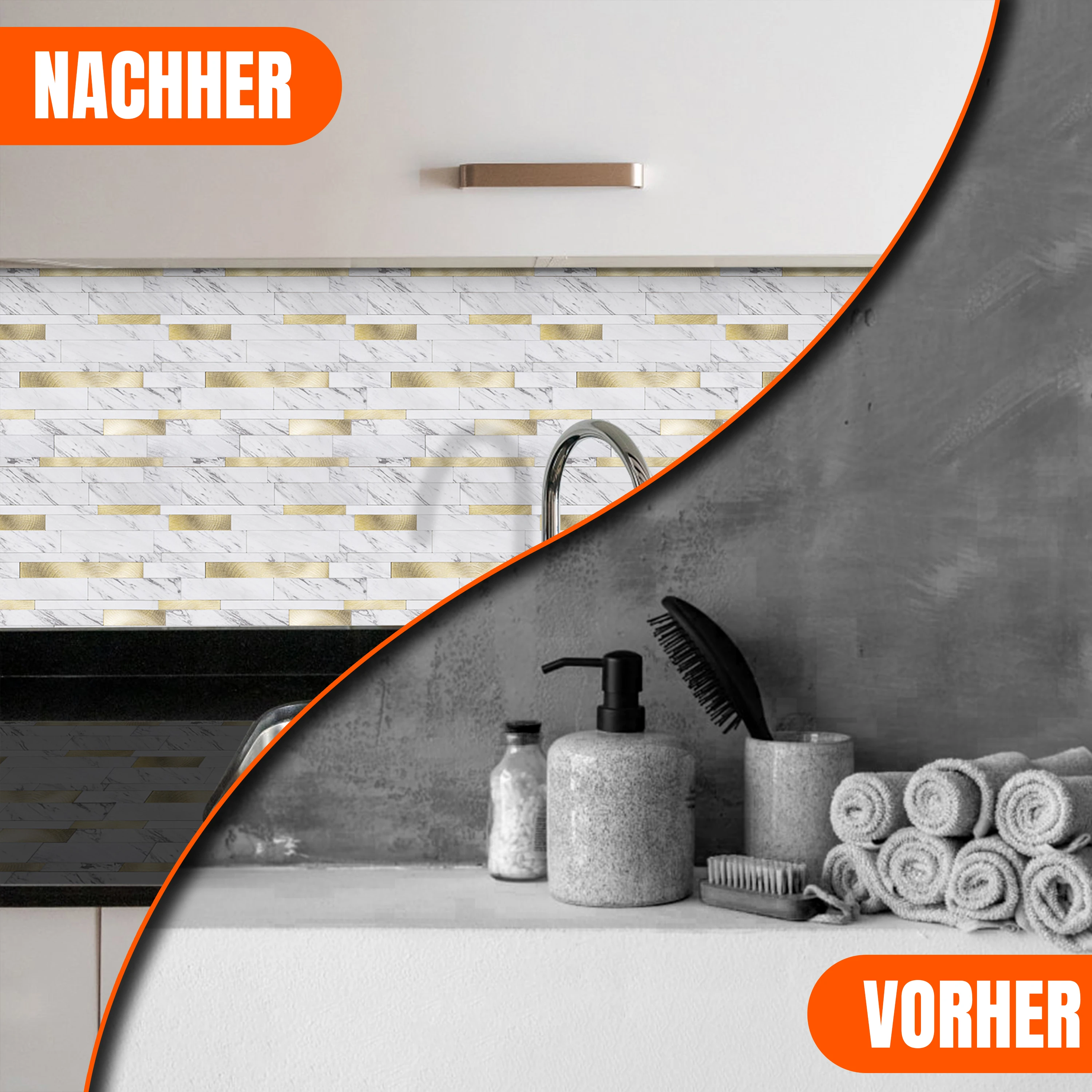 Diese einzigartige Mosaikfliese vereint das zeitlose Aussehen von weißem Marmor mit modernen, goldenen Akzenten und schafft so ein beeindruckendes Design, das jedem Raum einen Hauch von Luxus verleiht. Die rechteckigen, länglichen Elemente wechseln sich ab und sorgen für ein dynamisches und zugleich elegantes Erscheinungsbild.