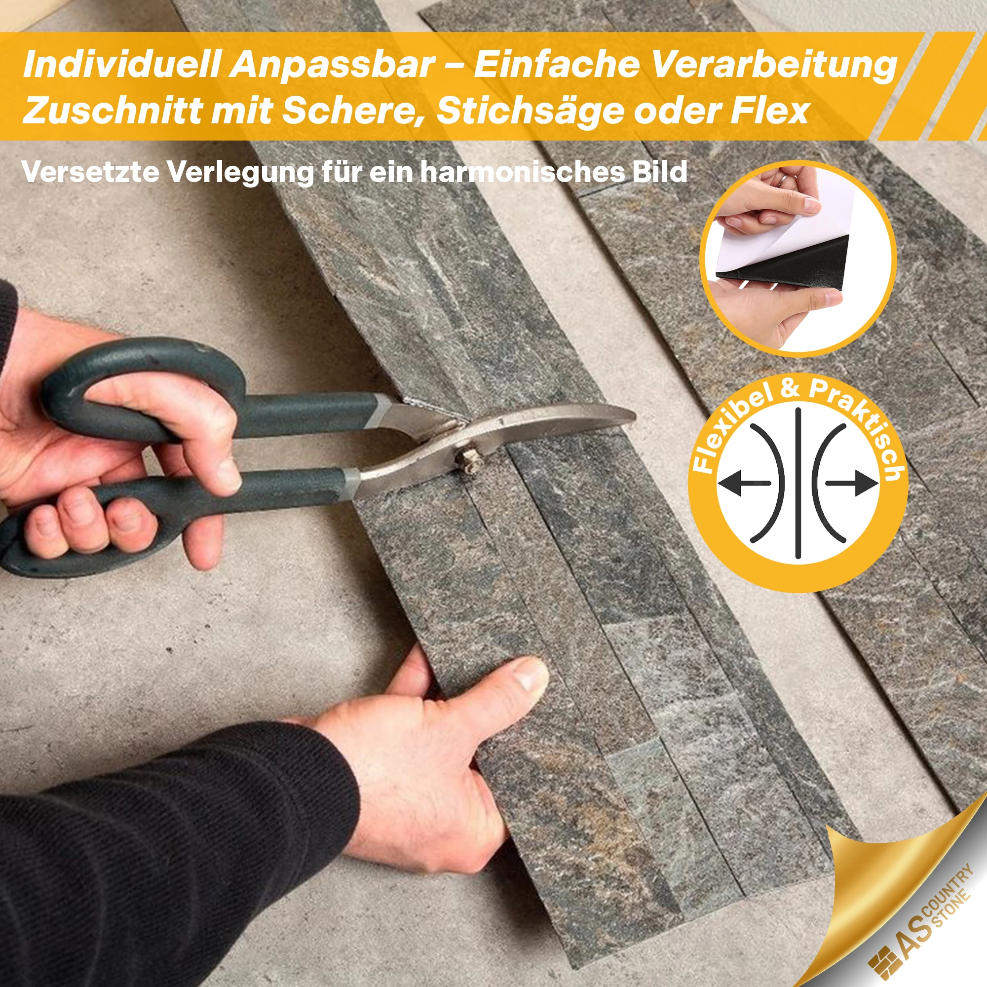 Anbringung: | Folie auf der Rückseite wird abgezogen und anschließend an die Wand angedrückt, Zuschnitt mit kräftiger Schere/Stichsäge/Kreissäge, jede Reihe wird versetzt verlegt, wie bei Laminat |