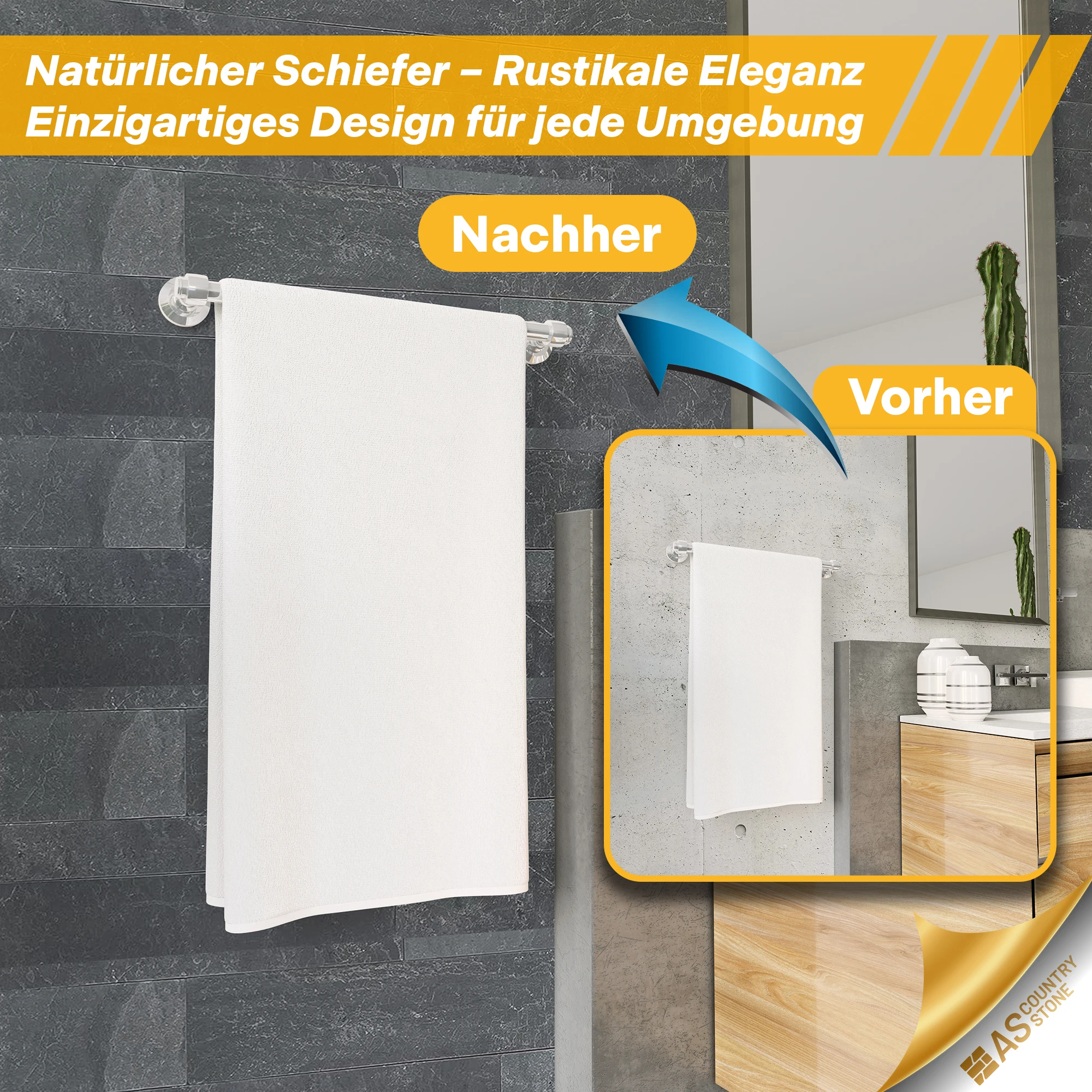 Unser Wandpaneel 2014 aus unserer Dünnschiefer-Serie überzeugt durch seine atemberaubende Optik. Sie müssen es selbst erleben: Mit seinem schlichten dunklen Ton passt es zu jeder Umgebung und wertet diese massiv auf. Geschmack, Stil und etwas Exklusivität halten in Ihren vier Wänden Einzug. Die Oberfläche aus echtem Schiefer sorgt für faszinierte Blicke und fühlt sich hervorragend an. Verleihen Sie Ihren vier Wänden einen unglaublichen Look. Das Material ist echter Schiefer – das fühlt und sieht man.