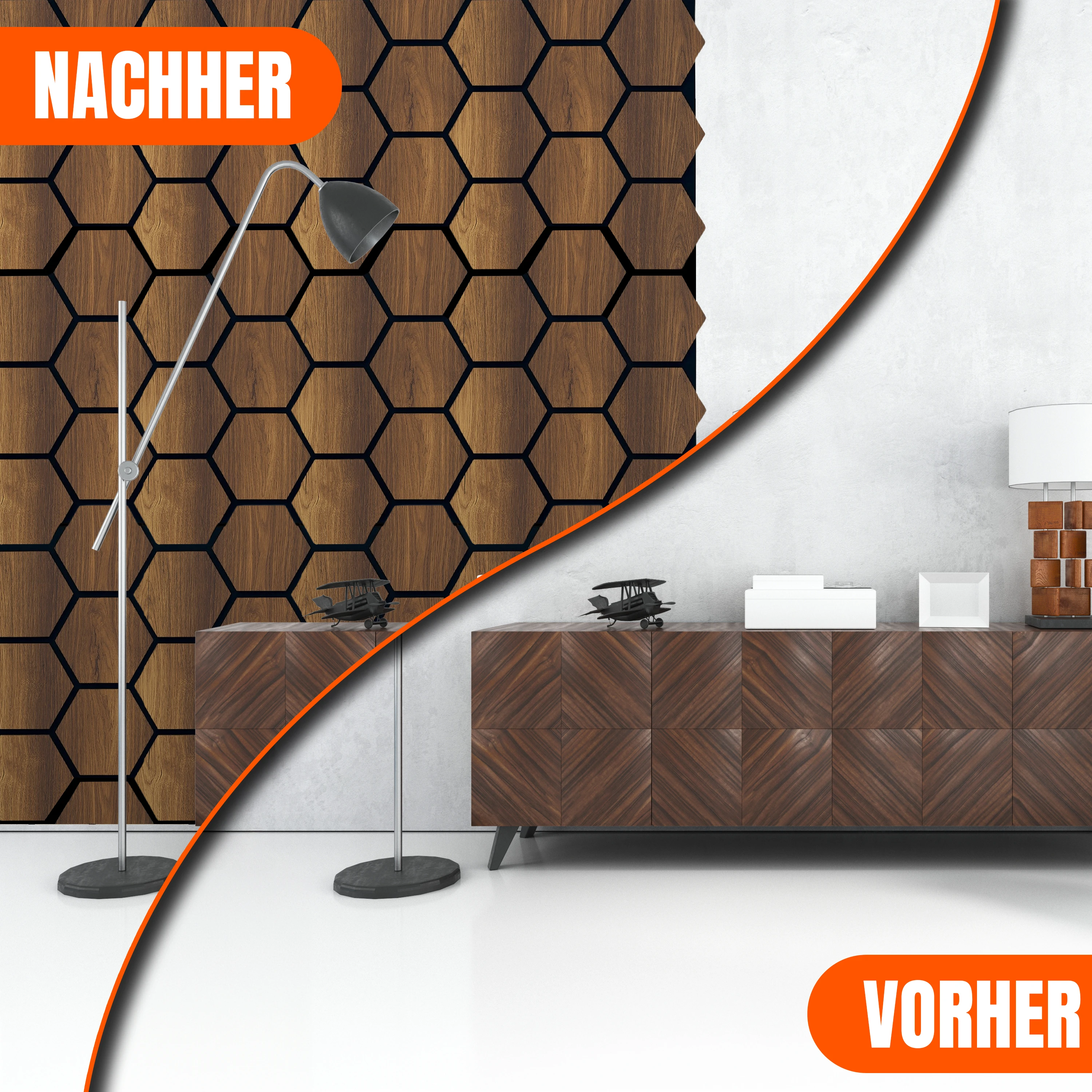 Dieses hochwertige Wandpaneel kombiniert stilvolles Design mit praktischer Funktion. Die hexagonalen Kacheln in der tiefen, warmen Farbgebung eines dunklen Eichenholzes verleihen jedem Raum einen Hauch von Barockem Charme und moderner Eleganz.