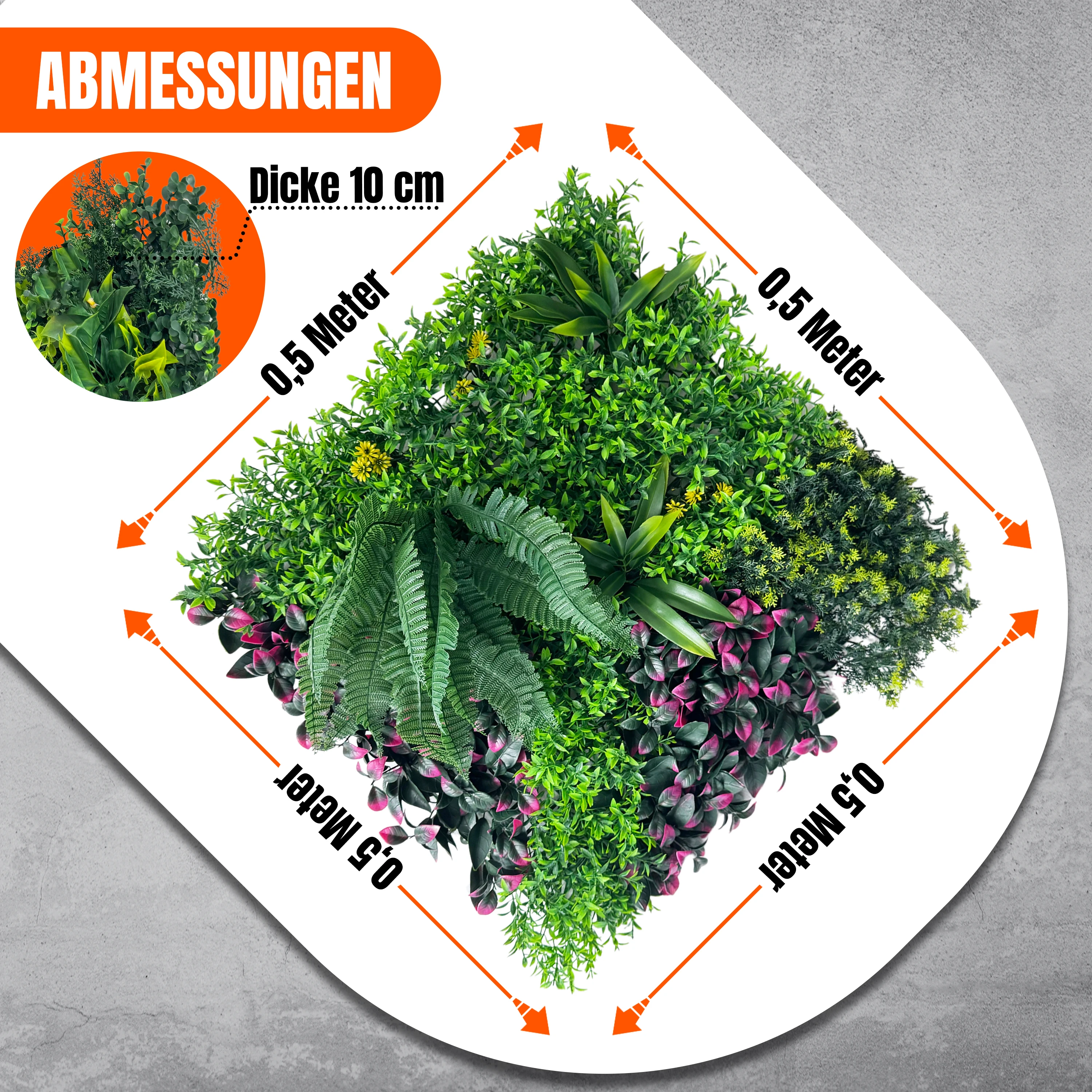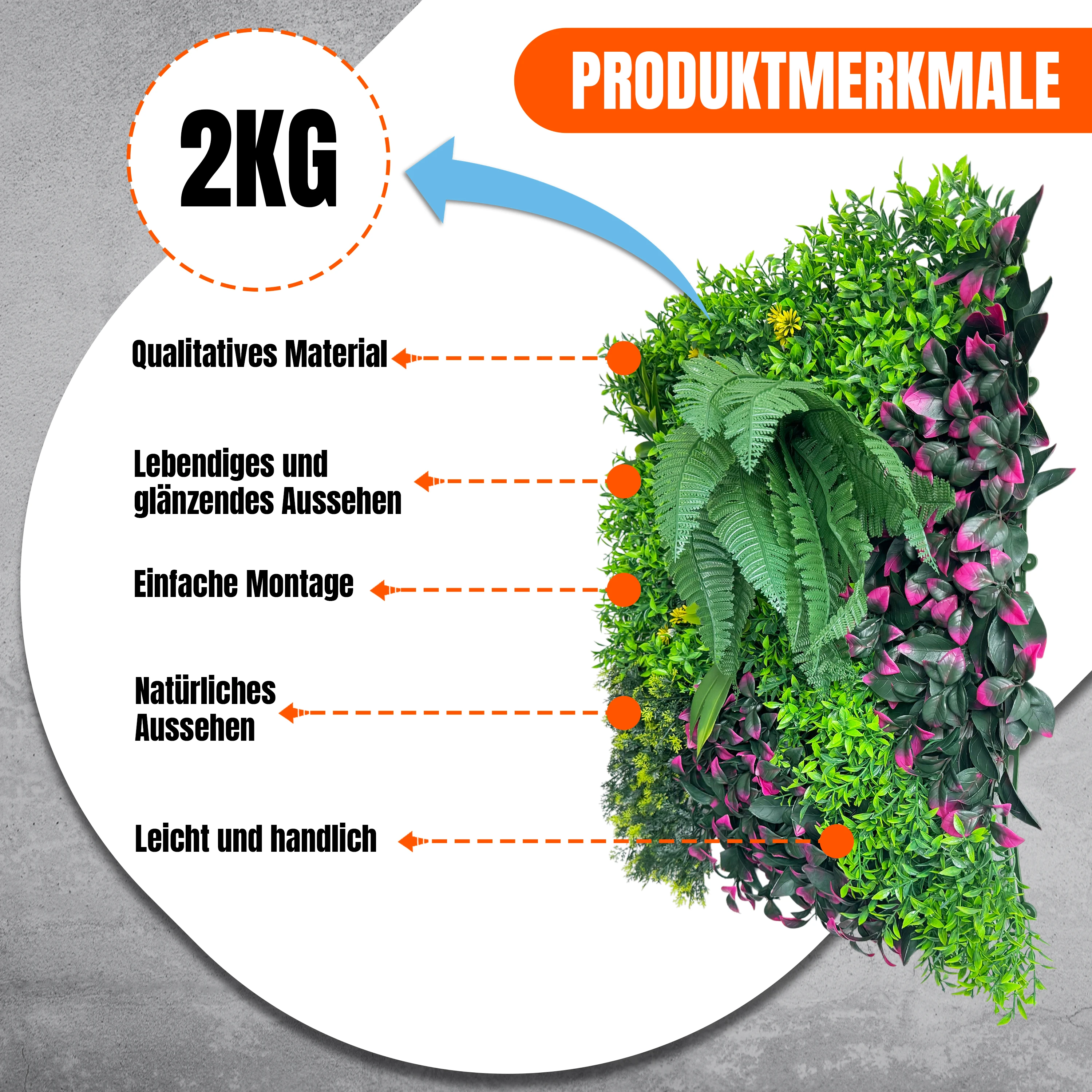 Unser Produkt, die Kunsthecke "Garten", ist eine exquisite Wandverkleidung, die lebensechte künstliche Pflanzen, Gräser und Blätter in einer harmonischen Zusammensetzung vereint. Mit einem Maß von 50 x 55 x 10 cm (H x B x T) und einem leichten Gewicht von nur 1 kg, schafft dieses Paneel sofort ein beeindruckendes, pflegeleichtes Grün an Ihrer Wand.