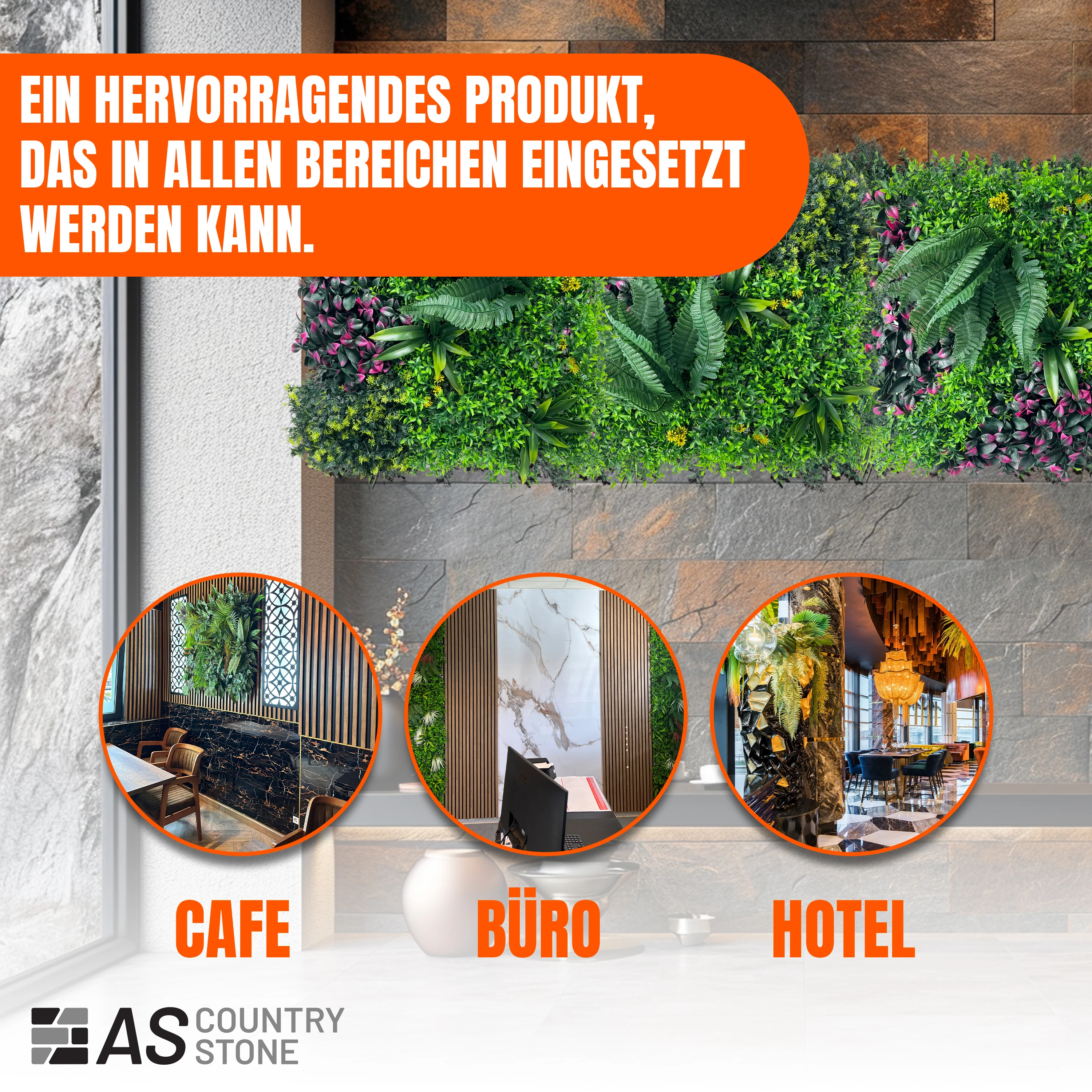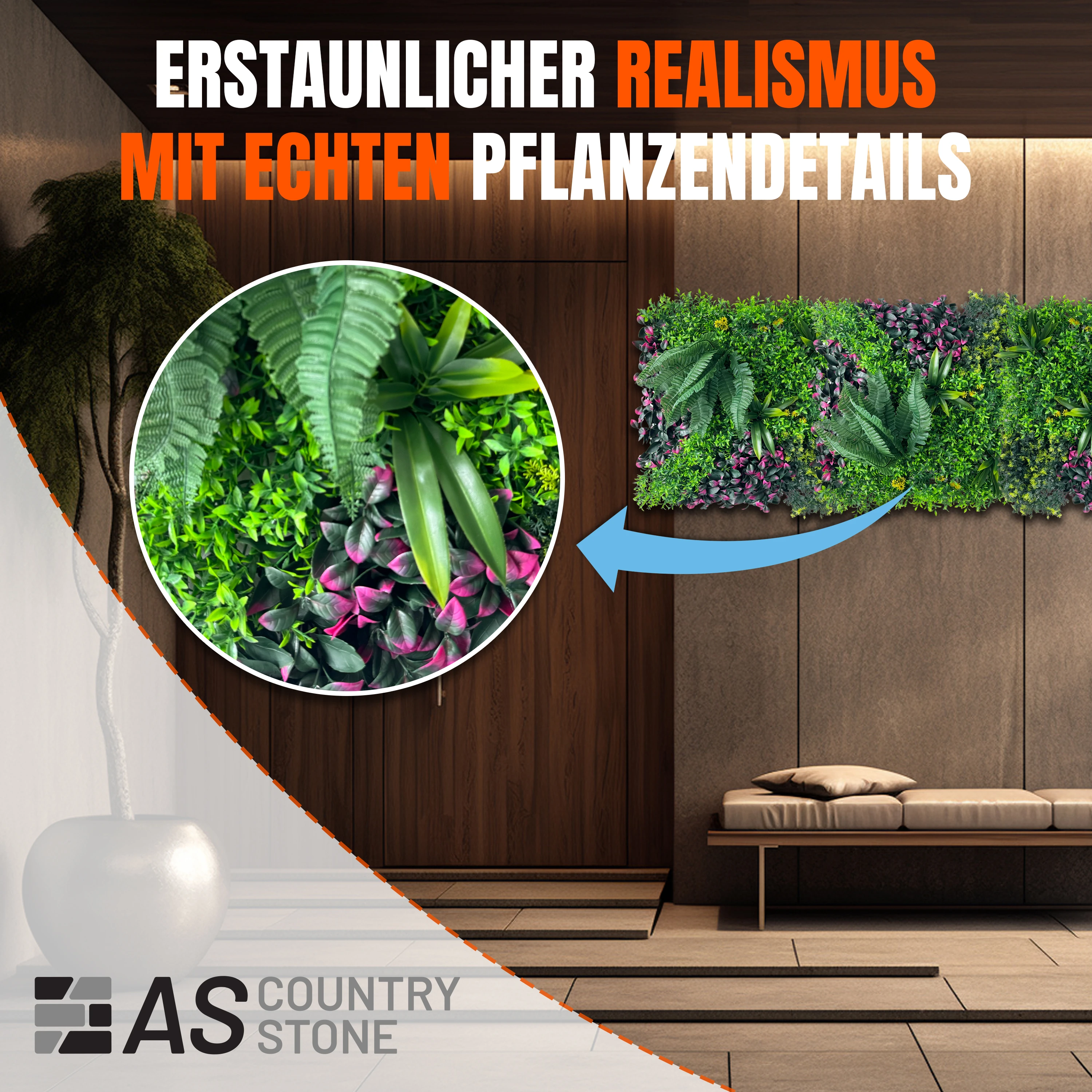 Verwandeln Sie Ihren Wohnraum in ein grünes Paradies mit der Kunsthecke "Garten" von AS Country Stone. Der Charme eines lebhaften Gartens, ohne dass Sie jemals gießen müssen.
